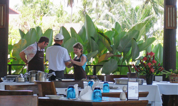 주문한 음식을 기다리면서 시선을 돌려보니 내 테이블 건너 끝에 거금(?) 커플당 4000바트짜리 타이쿠킹 프로그램을 하는 사람이 보인다.
