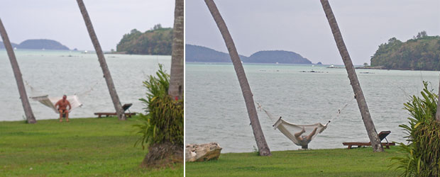 그 밑으로 양쪽 나무를 기둥삼아 해먹이 바닷바람에 흔들거리는....
