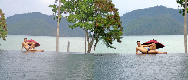 레스토랑은 복층 구조로 해변에서 가장 안쪽은 실내, 그리고 실외, 마지막으로 사진속의 보이는 건물 바다와 가장 가까운곳이 풀바이다..
