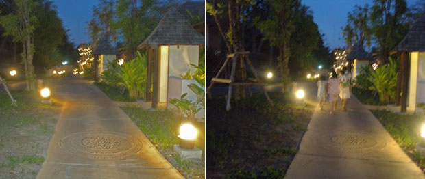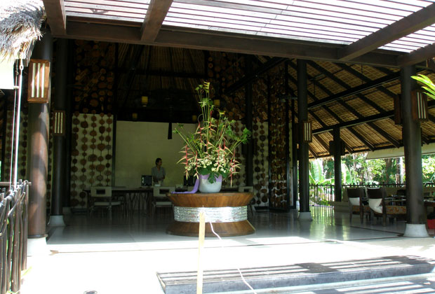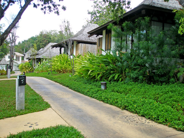도착해 보니 도로앞에 분위기 있는 간판이 달려 있고, 초입엔 보이지 않지만 양쪽 고무나무들 뒤로 원형 마당으로 리조트가 시작된다.