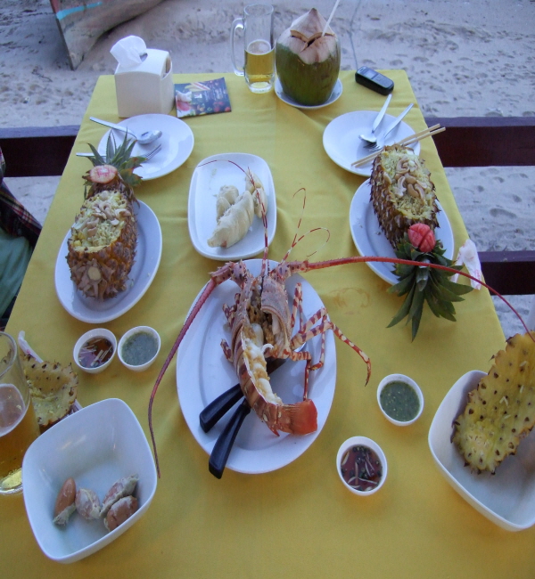 그리고선 탕케라는 씨푸드점에 가서 저녁을 먹는데 '돌'이 우리가 원하는 것에 대하여 흥정을 하였습니다. 랍스터를 골라서 먹는데 한국에선 가능한 버터구이란것이 없는지 말이 안통했는지 모르지만 뭐 적당히 시켜먹었습니다.                                           파인애플 밥과 두리안, 코코넛, 싱아맥주와 더불어서 먹는데 아주 맛있게 먹었습니다. 한국사람은 보이지 않고 중국사람들이 좀 보이더군요.