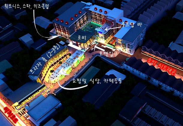 방라로드에서는 소이드래곤으로 들어가면 호텔 로비를 정면으로 들어갈수 있으며, 비치로드에서 들어가면 호텔 프라자로 해서 로비 측면으로 들어가게 된다.