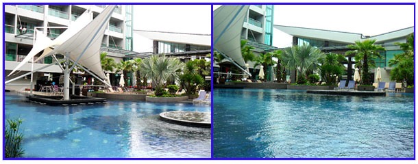 프라자를 제외한 본 건물이 ㄷ자 형식으로 되어있어 건물과 건물 사이에 수로로 수영장이 연결 되어 있어 2개의 수영장을 하나로 연결 해 놓았다.