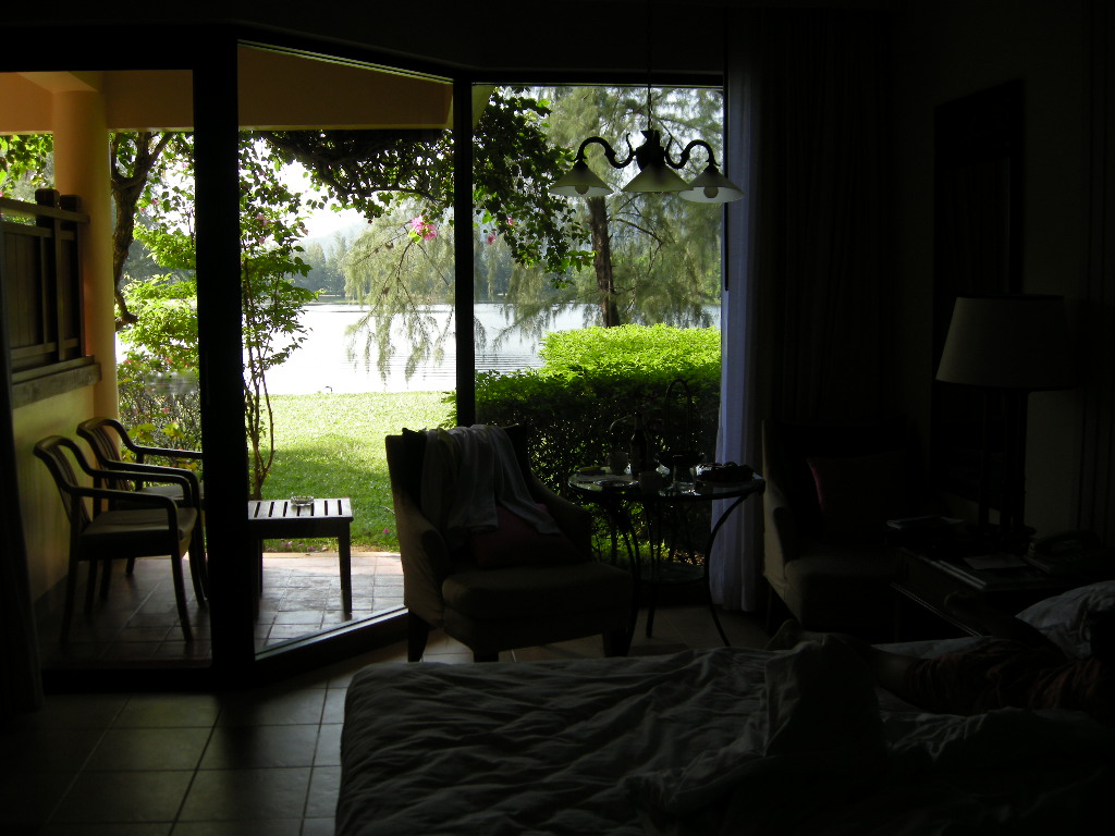 느즈막히 일어나 보니 창밖에 새소리가 울리고 풀밭너머 호수경치는