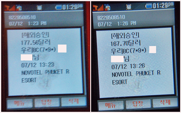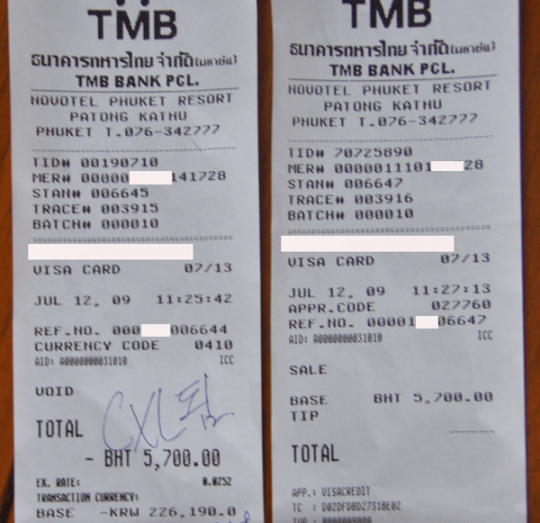 호텔에서 은행에 청구하여 받는 금액은 지금 명세서처럼 5700바트로 동일하지만, 지불하는 입장에서는 5700바트에 대한 원화 청구시(하단 왼쪽 전표)는 로밍폰으로 177달러가 좀 넘게 문자가 들어왔지만 취소하고 5700바트로 바트 청구하니(하단 오른쪽 전표) 167달러라 청구되어 5700바트 사용에 대한 청구 방식에 따라 무료 10불차이가 난 것이였다.