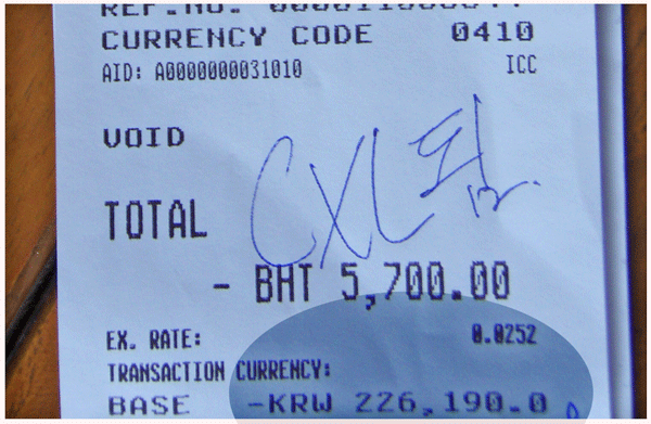 년초 모 호텔에서 사용한 비용이 이상하게 많이 나와 명세서를 보니 사용한 금액이 바트나 달러가 아닌 한화로 나와 이상해서 호텔측에 문의해보니 사용한 비용이 자동 한화로 바뀐다고 하여, 그 호텔만이 이상하게 rate을 적용하는것이 아닌가 생각하고 있던 차..