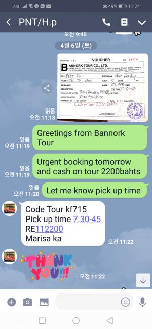 혹시나해서 원본글에 카이섬 투어 예약당시 라인으로 주고 받은 캡쳐 사진 한장과,오늘 오전에 투어사 사무실과 통화했고,사장과 통화한 통화 기록 캡쳐해서 올려드립니다.