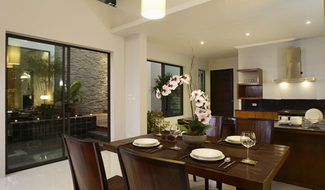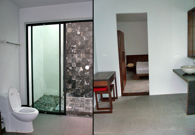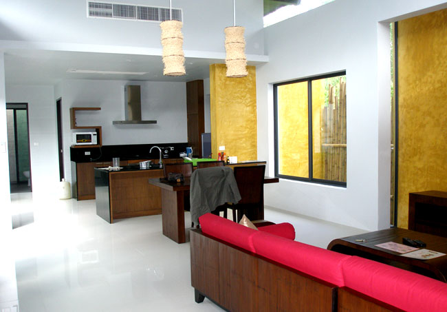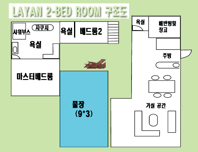빌라 구조는 2-베드룸으로 거실건물과 침실건물 사이 중앙에 9*3미터의 풀장이 있다.