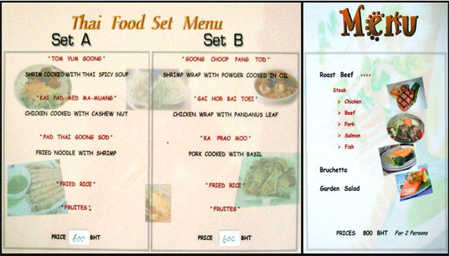메뉴의 경우 일인 600밧과 2인 800밧짜리 메뉴가 역시 소파테이블위에 있다.