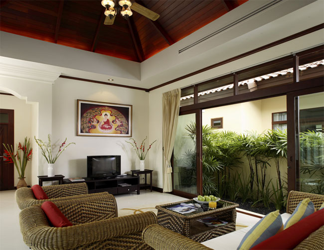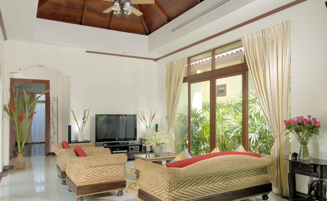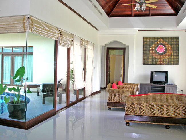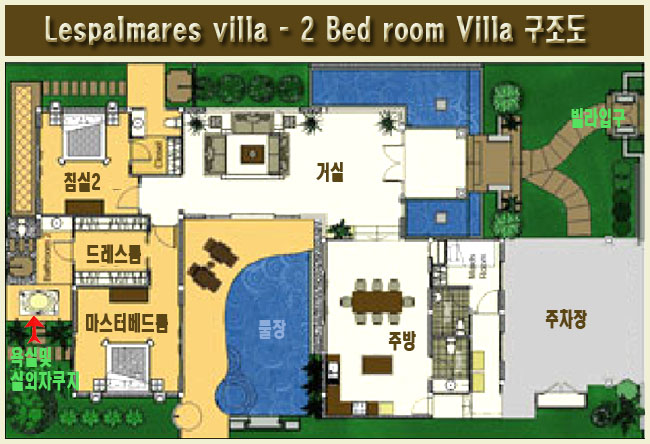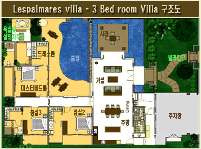 거실 안쪽으로 보이는 곳은 두번째 침실이며, 두번째 침실에서 살짝 보이는 복도 형식의 입구로 풀장에서 거튼이 드리워져 있는 곳이  마스터 베드룸이다.