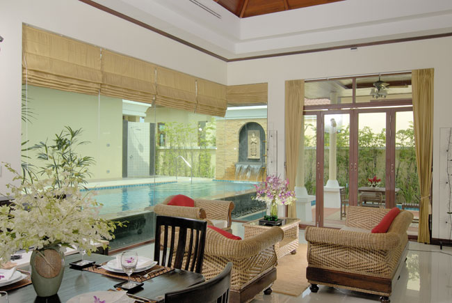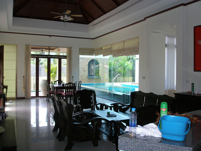 현관문을 열고 들어섰을때 보이는 거실에서 유리문 넘어 보이는 풀장이 보이고, 사진에는 아직 보이지 않지만 왼편에 주방시설과 다이닝 테이블이 구비 되어있다.