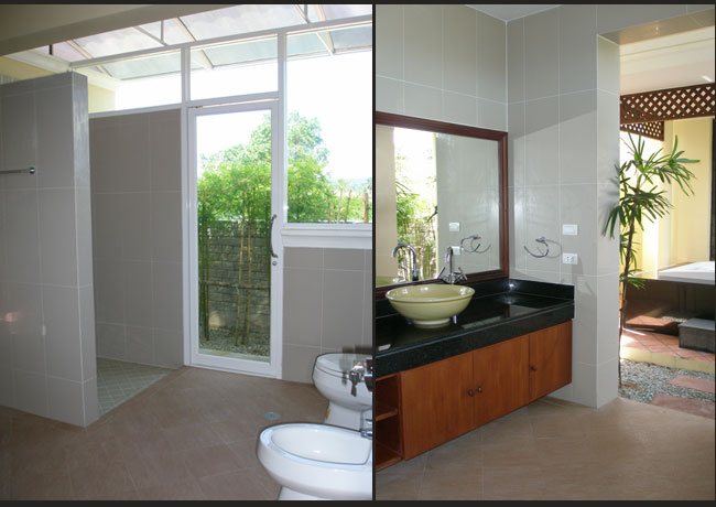 욧길은 역시 화장실과 샤워실이 구분되어있다 (위쫏 사진의 왼쪽), 변기 앞으로 보이는 것이 샤워실이다..샤워실 옆으로 나아있는 공간으로 들어가면 세면대와 야외 자쿠지 욕조로 연결된다.