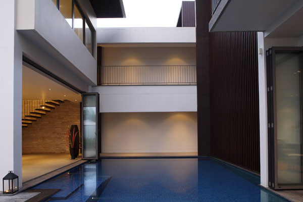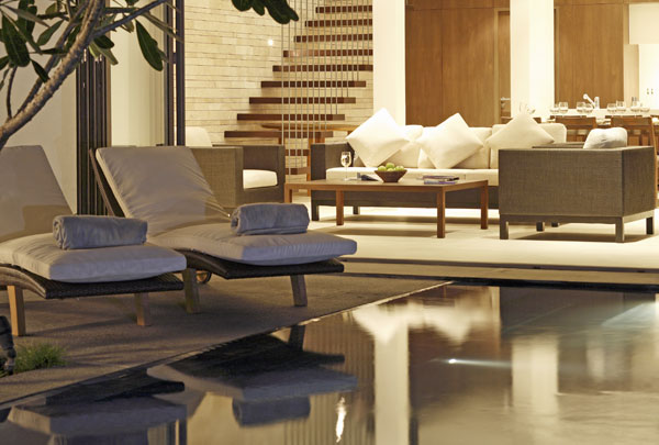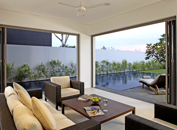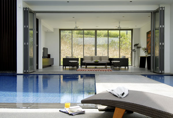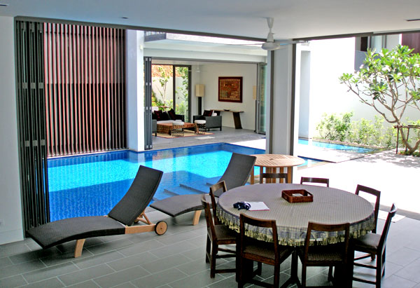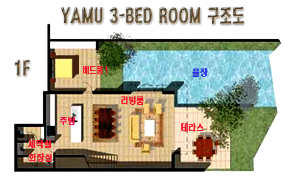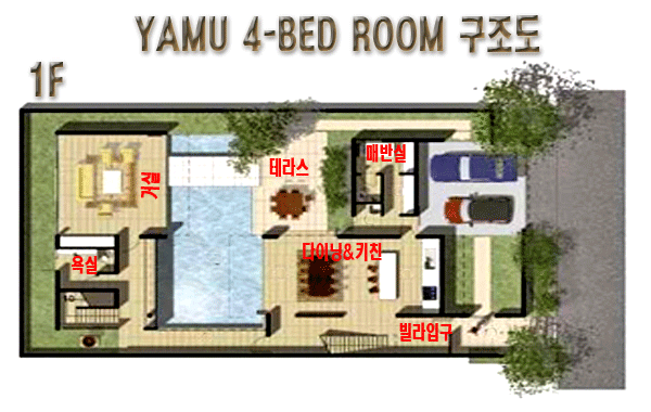 1층 현관에서 들어서면 빌라 다이닝과 테라스...풀장..그리고 풀장 건너편으로는 거실이 있다.