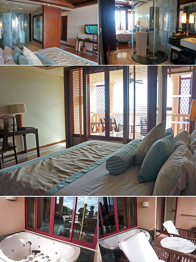 그리고 다시 디럭스 오션 페이싱의 침대옆 소파 공간을 외부로 빼서 야외 자쿠지를 놓은 방은 디럭스 오션페이싱 스파, 그 방이 다시 건물 양끝에 위치하여 역시 옆에 테라스가 하나 더 있음 프리미엄 디럭스 스파.