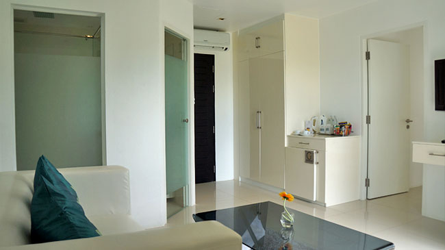 객실은 싱크시설이 갖춘 다이닝공간과 거실공간으로 나누어져 있으며, 그 공간 사이로 난 문을 열고 들어가면 침실이다..