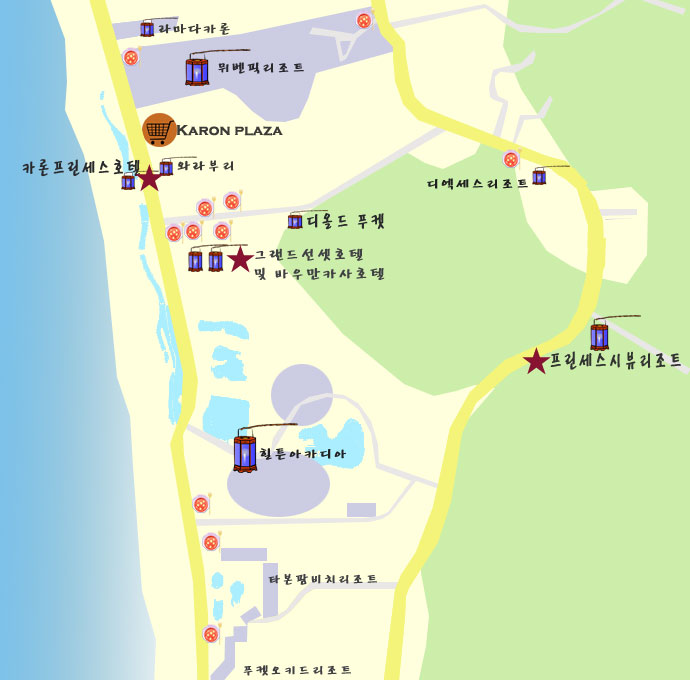 이렇게 생긴 카론을 들여다보면, ★로 표시된 호텔들중 오른편 프린세스 시뷰호텔과 카론 프린세스, 그리고 그랜드 선셋과 바우만카사이다...