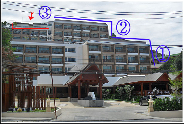 1번 아래층 건물은 1층~3층으로 이루어져 있으며, 객실은 일반 디럭스룸, 그리고 2번인 그 윗 건물은 역시 4~6층으로 4층 메인풀장과 그리고 디럭스 풀엑세스룸, 5-6층이 디럭스 시뷰룸, 그리고 6층 옥상에서 시작된 7층은 작은 풀장과 거실이 분리된 스윗룸으로 이루어진다...