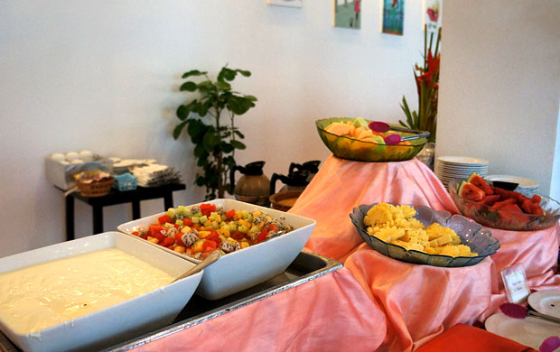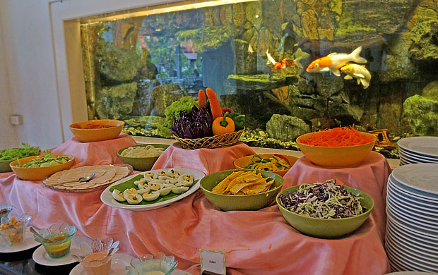 아주 기본적인 샐러드와 과일, 그리고 종류별로 한가지씩 나열된 음식들...