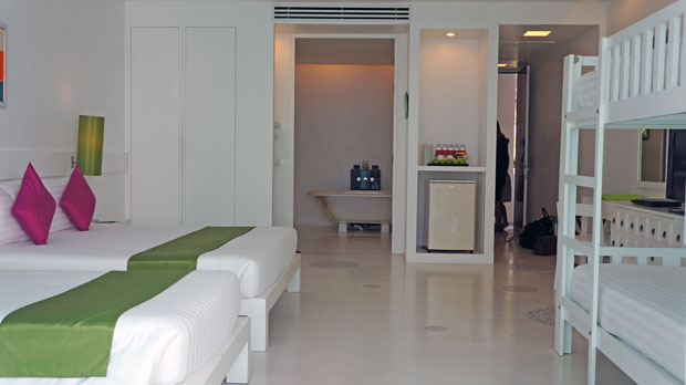 훼밀리 룸 구조는 원룸에 2층침대, 그리고 더블침대 하나와 싱글 침대 하나로 5인이 가족이 투숙할수 있는 객실이다..