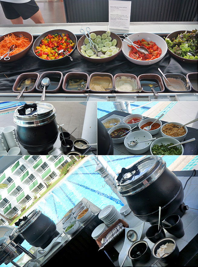 기본 샐러드, 2-3가지의 태국음식, 흔한 볶음밥도 없는 흰밥, 그리고 딤섬과 미소된장국...